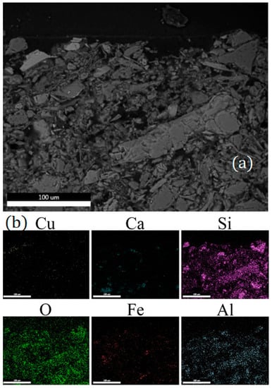 (a) SEM image in BSE mode of the painted layer and its substrate; (b) EDX elemental distribution maps (scale bar: 100 µm).