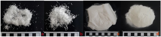 The glass additives used. (a) 3 mm fibers, (b) 6 mm fibers, (c) beads, (d) bubbles.