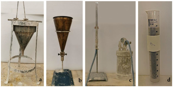 Flow time was measured according to ASTM C939-02 [38] and EN 445: 2007 [39] standards (Figure 2a,b). Measurements were taken immediately and 1 h after mixing to further evaluate the efficiency of mixtures through time. The time limit applied was 10–11 s (measured at the ASTM cone), which, according to former research work [14,32,34,37], guarantees performable grouts both at fresh and hardened states. The water content was respectively adjusted.