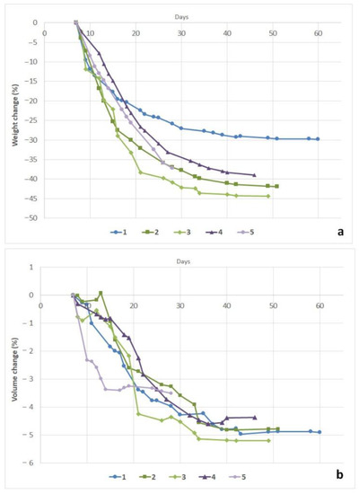 Shrinkage deformations of the grout specimens. (a) Weight changes; (b) volume changes.