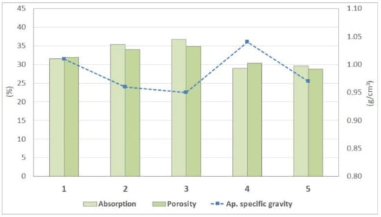Apparent specific gravity was decreased in compositions 2 and 3 and slightly increased in composition 4. In glass bubbles (comp. 5), it was slightly reduced, following its low density (Table 2) and in accordance with relevant literature [24]. These variations were in line with other research work [22], indicating that the density and grain size of GP may influence the density of the final products.