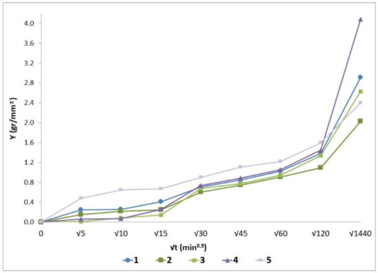Water absorption due to capillary action (Figure 5) showed a higher tendency by glass beads (comp. 4) and bubbles (comp. 5), while it was lessened by fibers. The 6 mm glass fibers seemed to present lower values, according to former research work [14]. Generally, in all mixtures, capillary absorption was increased with time, presenting the higher values at 24 h (1440 min). This phenomenon was contrary to other building materials’ performance (i.e., lime-based mortars), which show an intense value increase during the first measurements and further stabilization due to the equilibrium achieved between the absorbed and evaporated water [3]. According to former research work [32,34,37], lime-based grouts present an increasing capillary absorption throughout time and depending on the nature and characteristics of their constituents.