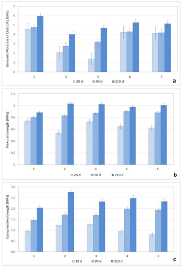 Mechanical properties of the grout compositions (28, 90, 210 days). (a) Dynamic modulus of elasticity; (b) flexural strength; (c) compressive strength.