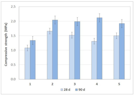 Compressive strength (Figure 6c) showed the more extreme changes throughout time. The values were 0.8–1.3 MPa at 28 days, 1.5–2 MPa at 90 days and 2–2.8 MPa at 210 days, resulting in a 30–150% strength increase at 90 days and 80–200% at 210 days. The highest increase for both ages was recorded with the addition of the glass beads and bubbles. The highest 28 d strength was given by fibers (comp. 2–3), whereas the highest 90 d strength was given by glass beads (comp. 4) and bubbles (comp. 5). The final (210 d) strength was enhanced by all additives (up to 40% compared to the reference grout), with the highest values recorded in the 3 mm glass fibers (comp. 2).