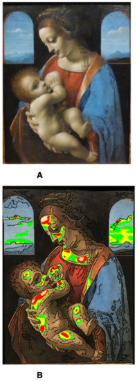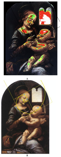 In conclusion, our software, based on mapping of “hot spots” of individual colors, appears to be a robust tool for searching for the presence of any golden ratio in any painting, not just Leonardo’s but anything created after him up to the present day. There is another important reason why we started developing this software—namely, in order to increase the probability of finding the original “author layer” in paintings that have undergone extensive restoration. After such manipulations, over a period of at least 500 years, there is a big challenge in discriminating the original author hand from restoration layers, as we observed in the case of “Donna Nuda” [26]. Our software is a navigation tool for more targeted sampling for chemical analysis. Our software also underlies another important aspect we have detected by oversaturating any individual color in his canvasses: the need to explore chemical composition of his paintings because in present times the colors look different than at Leonardo’s time. For example, green is very rare in his paintings and indeed our multispectral and hyperspectral analyses show that the appearance of a greenish hue in Madonna Litta’s mantle seems to be due to the conversion, over the centuries, of the pigment azurite into green malachite.