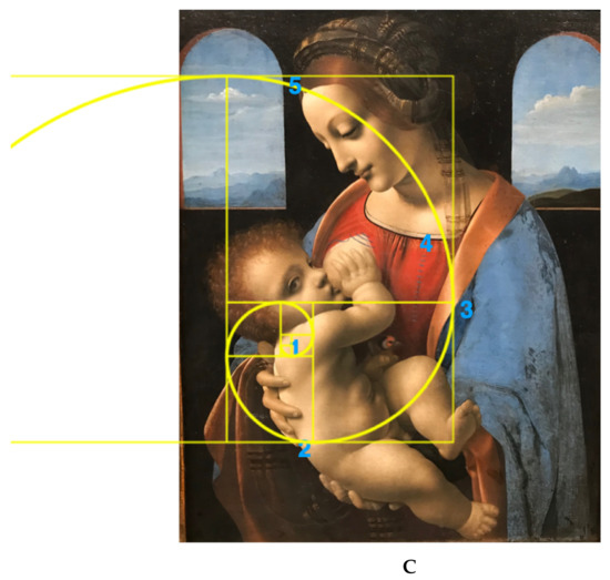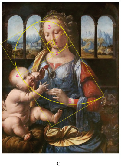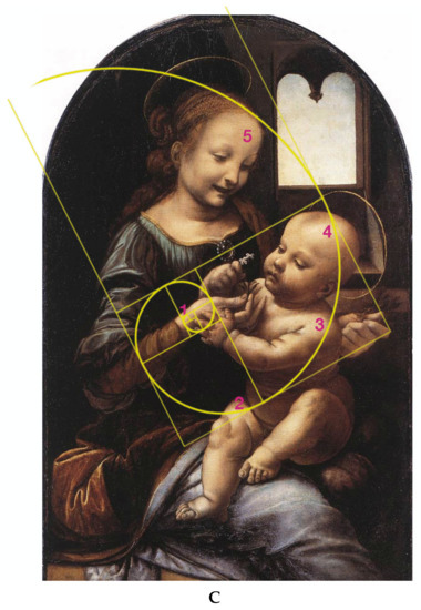 It is not possible to know when Leonardo started adopting the golden rule in some of his paintings, since less than half of his manuscripts have survived. As an example, when Francesco Melzi, his pupil, left France and returned to his villa in Vaprio D’Adda, he had with him 18 manuscripts of his Trattato della Pittura. Today, only six are known. What were the contents of the missing ones? Will we ever know? We suggest that Leonardo preferentially used the golden spiral rather that the simple golden rule, since the former is more inspiring and more intriguing to the viewers of his canvasses. We believe that Leonardo arrived at elaborating the golden spiral by sectioning conical seashells (easily available during his stay in Florence and visits to Pisa) and noticing the unique harmony of their growth in a spiral form. It is thus reasonable to assume that the Maestro used this biological inspiration, in a tri-dimensional structure, to reproduce it into the two-dimensional space of his canvasses. This might not be far from the truth if we examine, in detail, Figure 1C, showing the shape of the spiral in the Madonna Litta painting. Four points of the spiral (Nos. 1, 2, 4 and five) lie on the bodies of the Child and the Madonna, but this would not have resulted in a correct spiral. He needed a fifth point, which is to be found on a bright spot (No. 3) in the brown ribbon on the blue mantle of the Madonna. It should be noted that this bright spot has the same tinge and hue of the “incarnato” in the bodies of the two figures. There would have been no reason to place this bright, flesh-colored spot on the mantle ribbon unless he knew a priory that it was needed in order to obtain the correct shape of the golden spiral. Such harmonious spirals are also quite evident in the other paintings analyzed (see Figure 2, Figure 3 and Figure 4) and are confirmed too by the standard geometric ratios depicted in the black squares and rectangles imposed on each of the four paintings. There might be an aesthetic reason why Leonardo preferred the spiral arrangement: the eye of the viewer would be captured by the sinuosity of the spiral and this would ingenerate in him a kind of contemplative ecstasy, not dissimilar from the “Stendhal syndrome”. As additional information, we note here that Leonardo possibly did not make paintings of crucifixion of Jesus. The distribution of figures in these iconic representations are based on rectangular geometric arrangements of personages and difficult to be reduced to the golden section canons. On the contrary, in Gothic paintings, where knowledge of the golden rule was absent, crucifixions are very popular, since these painters had adopted rectangular and triangular schemes as canons of their layouts for their figures. We additionally remark here that, although there have been reports of the canon of golden ratio in the most famous painting the Mona Lisa, most of them drawn geometrically, the only report that traces a golden spiral on the same painting does not give a clue nor the positioning of a minimum of five points needed to generate it, so that such attribution appears to be quite arbitrary.
