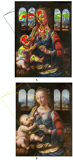 Figure 3 shows the same set of analyses performed on the Madonna del Garofano (painted by Leonardo ca. 1473 and housed at the Alte Pinakothek of Munich). Figure 3A exhibits the distribution of hot spots as mapped by the software on the two bodies. Figure 3B shows the golden spiral constructed by starting at the right cheek of the Child (No. 1) and continuing on to his front (No. 2). The trajectory extends to a bright spot on his right shoulder (No. 3) to swing up to the hand of the Madonna (No. 4) and finally to the tip of her nose (No. 5). This is not the only solution. As shown in Figure 3C, the spiral can have, as a starting point, the lips of the Madonna (No. 1), continuing on to her throat (No. 2) and her front (No. 3). It is also seen in the right side of the Child’s front (No. 4) to the hand and up to the wrist of the Madonna (No. 5). In both cases (Madonna’s Benois and Garofano), a viewer could enjoy the two canvasses by exploiting either of the two (or both) spirals.