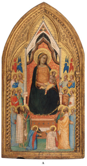 (A): Altarpiece on a wooden table by Bernando D’Addi (National Art gallery in Washington DC) representing a Madonna and Child with Saints and Angels. (B): Its rendering based on mapping of “hot spots” of individual colors by our software. This is clearly a negative control on which no golden rule nor golden spiral can be drawn and it essentially epitomizes all Gothic paintings.