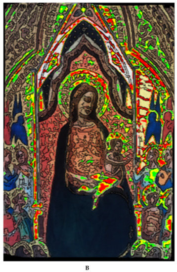 As shown in the two panels of Figure 6, it would appear that the blue mantle in the Madonna Litta, thought to have been colored with azurite, seems to have been slowly converted into malachite (green). A visitor to the Metropolitan Museum of Art of New York City would certainly notice the Madonna and Child Enthroned with Saints (also known as the Colonna Altarpiece), painted by Raphael, c. 1504. The painting was drawn on wood using oil and gold on a 172.4 by 172.4 cm frame. It is stated that, for the Madonna’s blue mantle, Raphael used azurite. At a close-up inspection, the same visitor would notice that the azurite blue of the Virgin’s mantle has darkened due to its degradation into green malachite and now this mantle looks greenish to the naked eye. The Madonna Litta masterpiece was exhibited at the Poldi Pezzoli museum in Milano for a couple of months early in 2020. We visited this exhibition a few times and accurately checked the Madonna’s blue mantle in search for any greenish hue, but none could be detected by naked eye and the only signs for this color decay could be revealed by our newly developed software. How do we reconcile these discrepancies, considering that most art historians state that here azurite was used by Leonardo, just as in the case of Raphael, and that the two paintings are coeval? The only explanation we can offer is that perhaps Leonardo did not adopt pure azurite but admixed it with other blue pigments, e.g., lapis lazuli (ultramarine), Egyptian blue, maybe even smalt (ground cobalt glass). Leonardo loved to play around with pigments and admix them until he obtained the special hue he was dreaming of. This being the case, such a mixture might have masked the slow decay process of azurite into green malachite.
