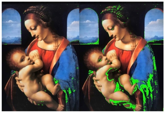 Monitoring the decay of azurite in the Madonna Litta painting via multispectral and hyperspectral analyses. The green areas show the progressive transformation of azurite (blue) into malachite (green) via a hydration process. For control, see Figure 1A. Malachite color in RGB color code coordinates is (11, 218, 81). Azurite stone color in RGB code is (0, 127, 255). (left) Malachite color spots locations on azurite color background; (right) distribution of other green tones on azurite color background.