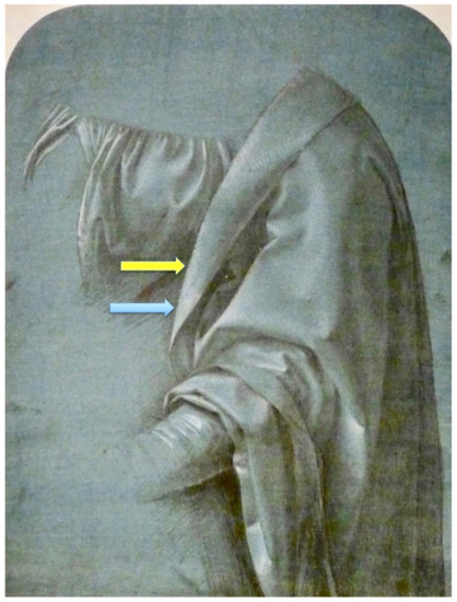 Preparatory drawing of Madonna Litta’s mantle made by Boltraffio. See text for explanation of the blue and yellow arrows.