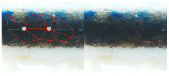 Yet, as stated in the introduction, our software, via multispectral and hyperspectral analyses and image processing, could also monitor the decay (if any) of pigments in the paintings of the Maestro. We have taken as an example the famous drawing Madonna Litta, in which it is known that Leonardo used, as a blue pigment, azurite (a copper carbonate of blue color, an analogue of lazurite, a tecto-silicate of complex sodium calcium aluminum silicate sulphate formula, which forms the bulk of the precious stone lapis lazuli). Lapis lazuli has been mined for centuries from a location still in use today in the mountain valley of Kokcha, Afghanistan. In Europe, this expensive powdered pigment was also called ultramarine, which literally means over the sea. During the Renaissance, Raphael, Leonardo da Vinci and Michelangelo Buonarroti used this pigment. On the contrary, azurite, as just stated, is composed of mineral basic copper carbonate, found in many parts of the world in the upper oxidized portions of copper ore deposits. The azurite mineral is usually associated in nature with malachite, the green basic copper carbonate that is far more abundant. Azurite was the most important blue pigment in European paintings throughout the middle ages and Renaissance, since it was much less costly than lapis lazuli. It might be expected that azurite, over the centuries, as canvasses are exposed to humidity, might slowly convert into malachite via a hydration process. Ultimately, then, the blue mantle of the Madonna Litta would turn from blue to green. Indeed, our software shows that this process has already begun in quite a few areas of the painting (Figure 6). Figure 7 shows a preparatory drawing of Madonna Litta’s mantle made by Boltraffio. See the text for explanation of the blue and yellow arrows. Figure 8 is a cross-section sample from the blue part of a Renaissance painting with priming, a warm brown underlayer, and black or dark gray layer blue paint. The triangulation shows the lazurite particles inside painting layer. White circles are centers of triangulation made by our software for identification of level of order between pigment particles. The malachite color in RGB color code coordinates is (11, 218, 81). The lapis lazuli color in the RGB color code is (18, 10, 143). Azurite stone color in RGB code is (0, 127, 255).