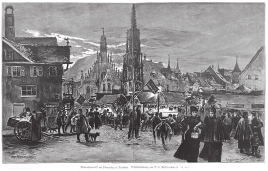 Nuremberg, Christmas market on St. Thomas’s Day (21 December). Wood cut by Pius Ferdinand Messerschmitt [].