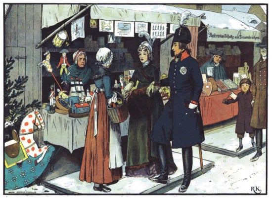 This trend was exacerbated by an increasing proportion of urban poor that further marginalized markets, which catered for the affluent middle-class despite being serviced by the rural poor in the form of hand-carved toys, as well by the urban poor in the form of retail services (Figure 3). After World War I, Christmas markets increasingly lost their economic market niche of selling seasonal gifts and toys (Figure 4) to the ubiquitous department stores, and similar trends played out in other German and Austrian cities [].