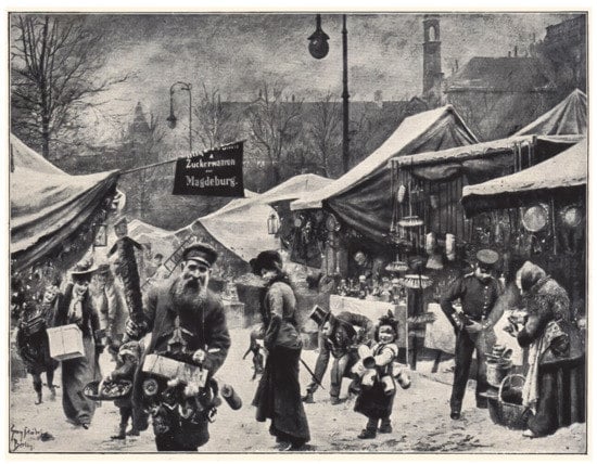 Christmas market in Berlin during the Imperial era (pre-World War I). Reproduction of a painting by Wilhem Schoebel 1913 [].