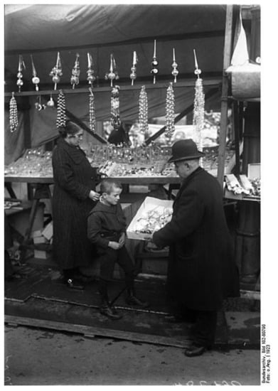 Stall selling decorations for Christmas trees at the Berlin Christmas market at the Alexanderplatz in 1923 (source: Bundesarchiv 102-00790).