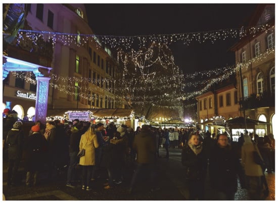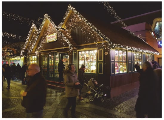 The experiential dimension of Christmas markets is often shorthanded as “Christmas atmosphere” or “Christmas mood” and is regularly queried in visitor satisfaction surveys. The overall Christmas atmosphere is considered an important element of a successful and appealing Christmas market, followed by the appearance of the stalls [,]. Moreover, external visual elements of the Christmas markets also have a major influence on visitor satisfaction, with markets in the settings of historic town centers engendering in visitors a greater willingness to recommend them to others [].