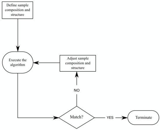The final model that outputs a near-perfect reproduction of the experimental spectrum can be considered to represent the real structure of the sample. A similar approach that also uses iterative simulations for quantification analysis can be found in the literature [21]. Figure 2 shows a block diagram of the simulation phase.