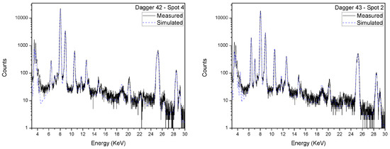 The simulated spectra for daggers 1 and 2 are shown in Figure 3. A total of four spectra from different spots were taken from dagger 1, and three were taken from dagger 2. The daggers match morphologically to known authentic ones, having parallels with daggers from Pirosu-Su Benatzu, Su Monte, and Complesso Nuragico di Albini [5,6].