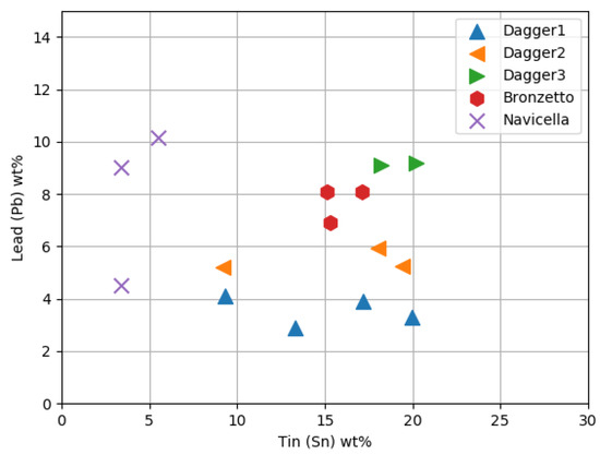 Figure 4 shows a scatter plot between Pb and Sn for all samples. Both daggers were simulated as bi-layered structures and were revealed to be made of a leaded bronze alloy with a high tin content. They also presented small varying quantities of As and Fe (As 1.505–2.7%–Fe 0.25–2.5%), commonly occuring in Sardinian copper ores [22]. The patina thickness could be estimated and ranged from 24 to 38 m. Small quantities of Ag, Ni, Bi, and Sb could be detected in the dagger 1 bulk composition.