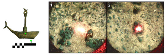 The navicella (Figure 1) had three spots investigated with the proposed methodology. The spots are shown in Figure 5: two spectra were acquired from its left side (one in a darker spot, probably an encrustration or oxidation—spot 2) and one from the bottom lower part of the boat—spot 3.