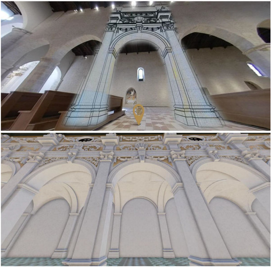 The second case study concerns the Basilica of Collemaggio and its old Baroque apparatus (Figure 4). Currently, the church has a substantially medieval configuration, up to the transept. This is the result of a stylistic restoration carried out in the early 1970s, in which the Baroque configuration was removed, aiming at restoring the church to a supposed medieval appearance. Based on the digital survey of the current church, a 3D model of the no-longer existing Baroque structure of the main nave is created, according to the studying of the graphic and photographic documentation of the period. The aim is its visualization and evaluation for the telling of the history of the Basilica, through an augmented reality application, which makes it possible to display, dynamically, and in real time, information related to what has been framed by a mobile device (Figure 5).