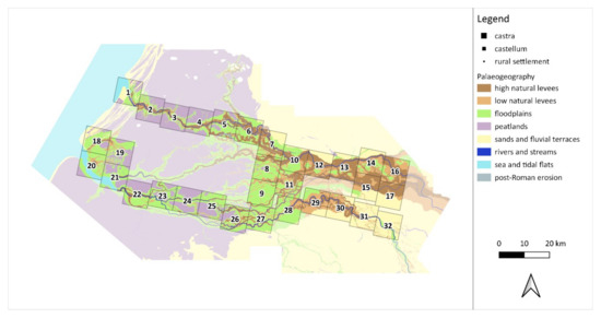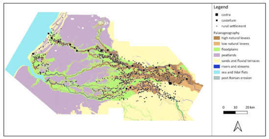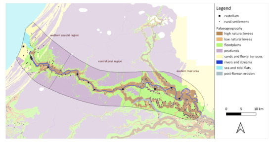 - Groenhuijzen, M.R. Palaeogeographic Analysis of the Dutch Part of the Roman Limes and Its Hinterland; Vrije Universiteit Amsterdam: Amsterdam, The Netherlands, 2018. [Google Scholar]