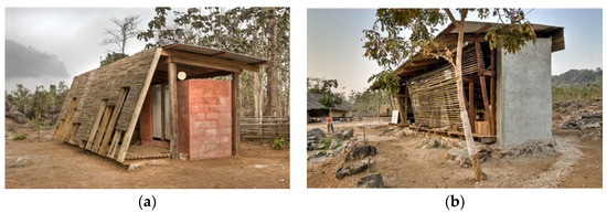 The buildings also have large openings and visual connection to the exterior, which is also an important principle of regional architecture. Floor levels are lifted, standing on stilts, providing a seat: “In this pattern of local Thai culture, the act of sitting or lying down on wooden floorboards became a feature of the normal lifestyle. As explained, the steps between the platforms in the houses were used for eating, resting or sleeping in order to obtain the benefit of the natural cool breezes passing through the space underneath” [16]. Bamboo shadings protect the interior without enclosing it hermetically. Life can flow in and around the houses uninterrupted.