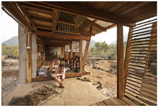 When it comes to colors, the two buildings work together. Wood, bamboo and locally found stones remained untreated, with a natural, rustic appearance—another important feature of building traditions of the region [17]. The walls built from concrete blocks are plastered and given a slight coloring: yellow and red appear on the bathhouse, and a natural, cooler, blue-gray shade on the library. In addition to its playful sight, the reason behind the difference lays in function. The bright colors of the bathhouse not only refresh the body but also enliven the spirit and slightly increase the feeling of warmth. Blue appears as a calming contrast. In the library, the cool, soothing shades help kids to focus. Books, toys and fabrics are enough of bright colored spots in the library. The softness of wood, bamboo, textiles and paper also provides the small study room better acoustics, which helps to focus attention and transforms learning into a pleasant daily activity.