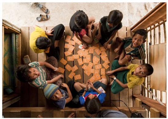 Group of children playing in the Library building. Photo of Safe Haven Library, photo: Pasi Aalto, architecture: TYIN Tegnestue (Andreas G. Gjertsen, Yashar Hanstad), Avail-able online: http://www.tyinarchitects.com/download/works/2009_safehavenlibrary/01_safehavenlibrary_photos_hires.zip (accessed on 13 July 2021).
