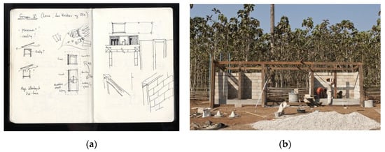 (a) Design on site—sketches. (b) Community building.Sketches of the designers and photo of the building process TYIN Tegnestue Architects (Andreas G. Gjertsen, Yashar Han-stad), Available online: http://www.tyinarchitects.com/downloads/ (accessed on 14 July 2021).