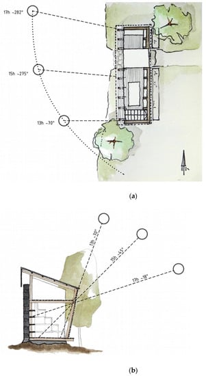 (a)Library floor plan sun path. (b) Library section, sun path. Sketches of san path, based on TYIN Tegnestue Architects (Andreas G. Gjertsen, Yashar Hanstad), Available online: http://www.tyinarchitects.com/ (accessed on 23 August 2021).