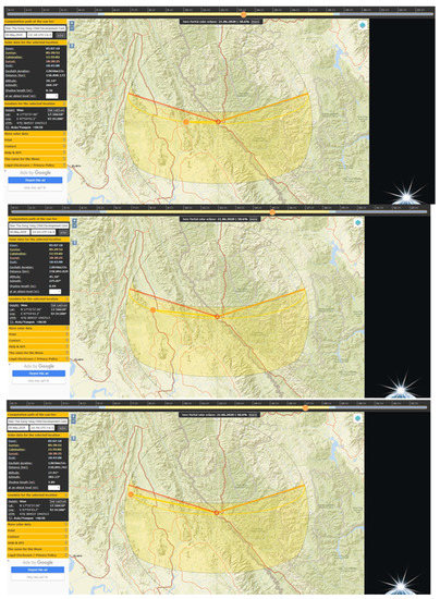 Sun path diagrams at 13:00, 15:00 and 17:00 at the location. Sun path diagrams. SunCalc.org, Available online: https://www.suncalc.org/#/17.5661,97.912,18/2021.08.23/15:15/1/3 (accessed on 23 August 2021).