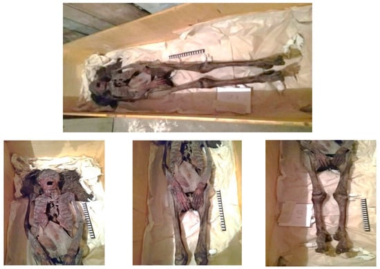 The main concern of the study is the mummy of an unknown woman (Figure 1) from the store of the Egyptian Museum in Cairo, Egypt. The mummy’s number is CIT 8; it was discovered in an unknown tomb by Winlock’s excavations at ThT71. Winlock’s written note cards say: S.A.K. (1935–1936) Servants Cemetery burial No. 2 (SENMUT) of the 18th Dynasty. The height of the mummy is 158 cm (height from the heel to the crown of the head), and the age was estimated in the elderly.