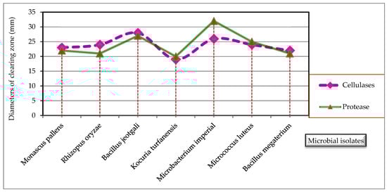 Cellulase(s) and protease produced by isolated microorganisms using cup plate technique.