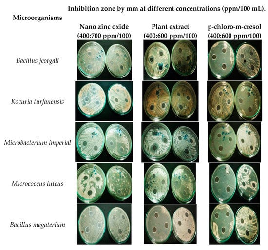 In the case of 4-chloro-m-cresol, no response could be detected at 400 ppm/100 mL concentration of all isolated microorganisms. It showed a response at 500 ppm/100 mL with most isolated microorganisms, but the good response was at 600 ppm/100 mL, where the diameter of a clear zone ranged from 24–45 mm.