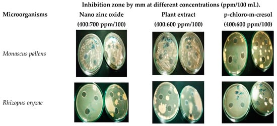 Determine inhibition zone (mm) of microbial species grown on Czapek agar and Nutrient agar as affected by three microcides: nano zinc oxide, natural plant extract (Ceratophyllum demersum) and 4-chloro-m-cresol.
