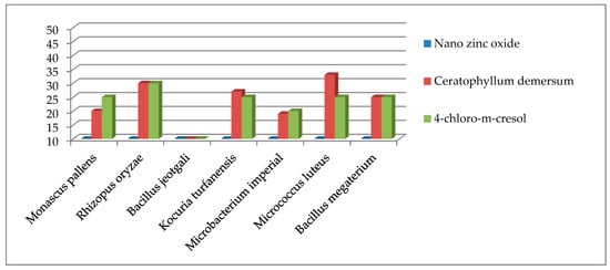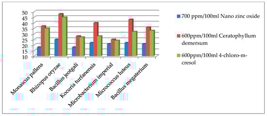 Results show that the concentration 500 ppm/100 mL of nano zinc oxide does not have any effect, but the plant extract had the highest inhibition zone with most isolated microorganisms. In the concentration of 600 ppm/100 mL, there is no response for nano zinc oxide as well, although the plant extract and chemical microcide have a good inhibition zone. Therefore, nano zinc oxide in the concentration 700 ppm/100 mL was compared to a concentration of 600 ppm/100 mL of the for natural Plant extract (Ceratophyllum demersum) and chemical microcide, 4-chloro-m-cresol (Figure 8 and Figure 9).