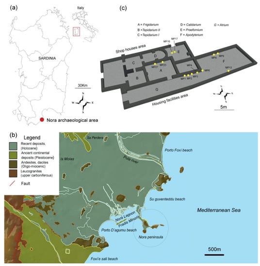 (a) Localization of the archaeological area, (b) geological map, and (c) Nora Small Bath with sampling points in yellow.