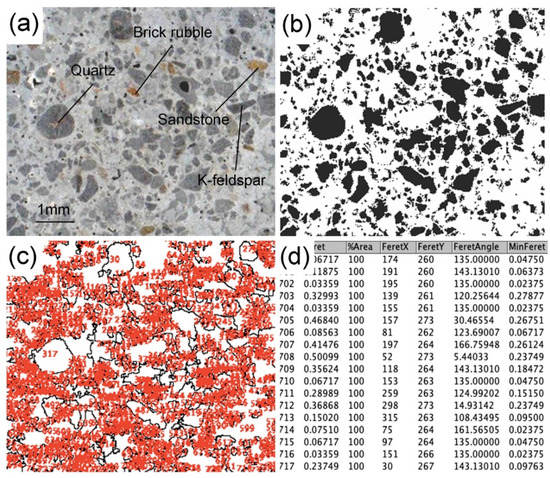 Analytical steps to perform the image analysis particle-size distribution. (a) 1200 dpi scanning image of a portion of the thin section. Aggregates of brick rubble, quartz, K-feldspar, and sandstones were present. (b) Binarization of the (a) by image J 1.51 s software. Black represents the aggregate and the white part represents the binder. (c) Analyzed particles with outline command and a progressive number was assigned to every clast to better identify it. (d) Data results of the Feret diameter DF together with other data regarding every detected clast.