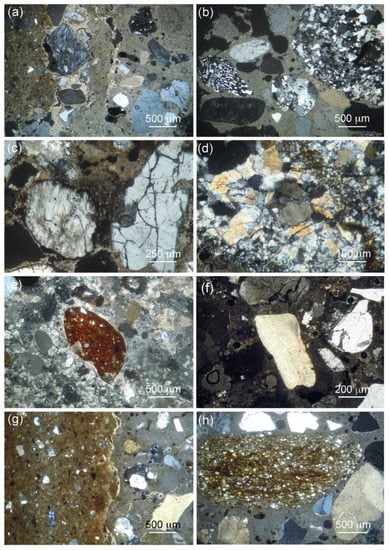 The aggregates consisted of magmatic (Figure 3b) and sedimentary rocks (Figure 3d,h), bioclasts (Figure 3f), brick rubble (Figure 3g,e) and crystal-clasts mainly composed of quartz-feldspar (Figure 3a,c), mafic, and charcoal.