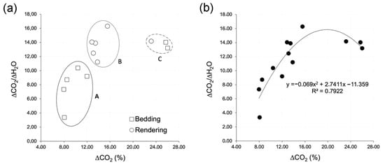 Thermal characterization of mortars: (a) ΔCO2 vs. ΔCO2/ΔH2O diagram for bedding and rendering mortars and (b) ΔCO2 vs. ΔCO2/ΔH2O diagram for all the samples in a single series.