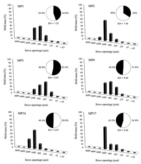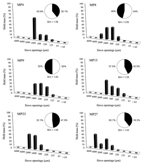 Usually, the ratio of B/A is inversely proportional to the thickness of the cast. In our case, the bedding mortars have B/A = 1.13. Contrary to what the Roman architect Vitruvio recommended, the mortars at the little Roman Bath present a high B/A ratio. A B/A ratio equal to 1.23 had been found in the renderings. This value is higher in respect to other B/A ratios identified in other Roman mortars from Sardinia [9]. Bedding mortars are mainly represented by an aggregate of a 1000–500 μm diameter, identified as a coarse sand (Table 6, Figure 5). In the sample MP3, a fine iPSD was related to the higher hold mass of aggregates at the sieves of 500–250 μm (medium sand). In MP16, conversely, the aggregate had a 2000–1000 μm dimension (very coarse sand). In the renderings group, all the mortars had a primary coarse sand (1000–500 μm) particle size (Figure 6), apart from the sample of MP23 in which an aggregate of very coarse sand, of 2000–1000 μm, was present.