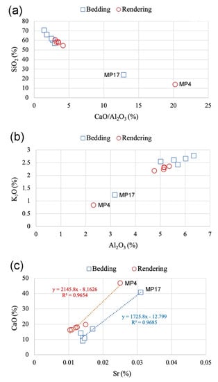 Figure 7a–c displays the diagrams of the CaO/Al2O3 ratio vs. SiO2, Al2O3 vs. K2O, and CaO vs. Sr. The CaO/Al2O3 ratio vs. SiO2 (Figure 7a) gives an indication of the binder and aggregate ratio. SiO2 was mainly included in the sand component, while CaO and Al2O3 were included in the binder (C-S-A gel) and/or on brick rubbles. The plot shows an exponential trend with R2 = 0.99 and most samples cluster together, but on the rendering MP4 and in the bedding mortar MP17, more binder was utilized. Similar results were also obtained by iPSD (Figure 5 and Figure 6). The linear correlation between Al2O3 and K2O (R2 = 0.99) supports this observation (Figure 7b), showing that these two oxides are hosted by the same inclusion (e.g., brick rubbles), and less aggregate was added in the case of samples MP4 and MP17. The correlation between CaO and Sr clearly divided all bedding and rendering mortars, and two different linear correlation lines are visible with R2 equal to 0.96 (Figure 7c). This observation suggests that different limestones were utilized to make the binder.
