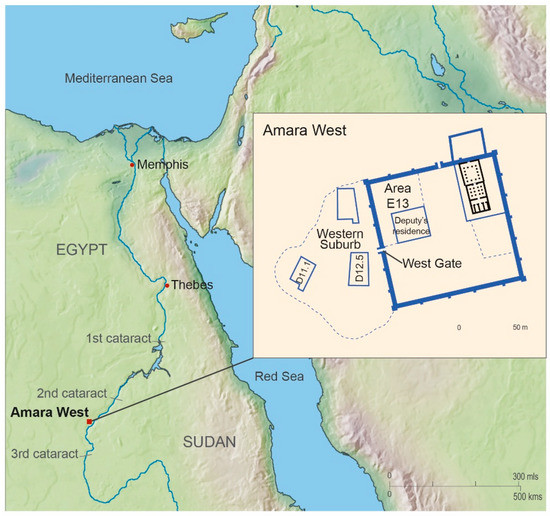 Amara West was founded in the reign of Seti I (c. 1306–1290 BCE) between the 2nd and 3rd cataracts of the Nile, in what is now northern Sudan. The walled town (108 × 108 m, Figure 1) contained a stone cult temple, storage facilities, housing, and a formal residential building which housed the Deputy of Kush, the foremost pharaonic official in Upper Nubia [16]. In the decades after its foundation, many of the storage facilities were co-opted for additional housing, with further dwellings being built outside the town wall from around 1180 BCE, in an area designated by excavators as the Western Suburb. Throughout, one can trace individual and/or household agency in the repeated reshaping and remodelling of the urban fabric [16,17]. Ceramic evidence suggests the town was abandoned by 1000 BCE, perhaps prompted by an increasingly challenging environment created by a retraction of Nile channels [18], though activity can be traced in the cemetery through the 8th century BCE [19].