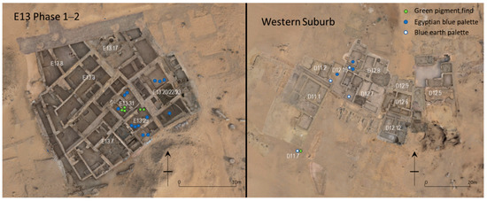 The first systematic excavations at Amara West, by the Egypt Exploration Society, took place between 1938 and 1950 [20]. More recent fieldwork at the site was undertaken by the British Museum from 2008 to 2016 [16,21]. All of the material discussed here comes from the latter excavations. A large number of the pigment-related finds in the walled town come from building E13.14, a facility north of the Deputy’s Residence founded early in the town’s history, comprising three long storage magazines with vaulted roofs, accessed via a service corridor. This building was later modified, with the north-eastern part being transformed into a workshop (E13.31), and the remainder was integrated into a large house (E13.7). The eastern part of that house later became another workshop suite (E13.29) (Figure 2). Combined, these areas contained over 300 ceramic shards with pigment on their inner concave surfaces, likely to have been used as palettes for preparing paint ahead of application, and many small lumps of raw pigment. Workshop E13.31 also contained two large grinding stones used for pigments, small copper alloy objects, pieces of crucible, ostrich eggshells, faience beads, small flint blades, and worked stone. Immediately to the north of E13.31 was an area (E13.17) perhaps associated with metalworking which preserved further concentrations of pigments and palettes in occupational deposits, amidst a typical array of other finds (stone tools, ceramic counters etc.). Another, smaller, concentration of palettes and pigments was found in space E13.20, and the underlying area E13.22, which are contemporaneous with E13.29 and E13.31. With a limited exposure, the character of E13.20 and E13.22 is unclear, though a series of curved walls may have defined an exterior space associated with houses. In contrast to these concentrations of color-related finds in the walled town, the Western Suburb yielded less material, though clusters of pigment lumps and palettes were found in houses D11.1, D12.8, and D12.9.