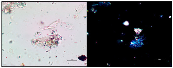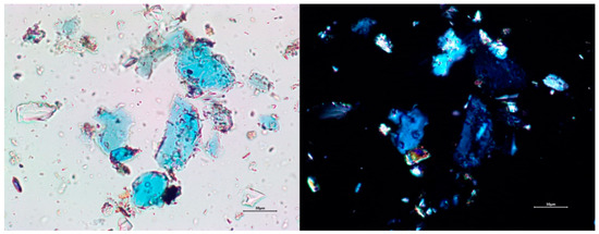 The seventeen bright blue samples were identified as Egyptian blue (Figure 3a). Egyptian blue can be identified using a combination of PLM (Figure 5) [25] (p. 26) and ATR-FTIR (Figure 6). An SEM-EDS analysis of the polished sections of blue pigment gave the atomic ratio of Ca:Cu:Si:O as 1:1:4:10, indicating that the material was calcium copper silicate CaCuSi4O10, a compound structurally and chemically analogous to the rare mineral phase cuprorivaite [30] (Table 1). In some cases, the Egyptian blue pigment had been mixed with gypsum or calcite, identified using PLM and ATR-FTIR (Table 2).