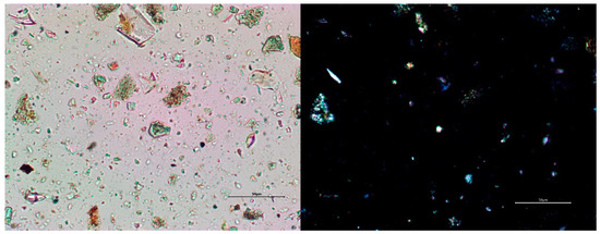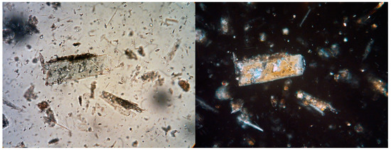 Dispersion of green pigment from pile in sand PS118 in plane-polarized light (left) and crossed polarized light (right) x400. Translucent green crystals with high relief in plane-polarized light and moderate birefringence suggest copper trihydroxychloride [25] (p. 61).