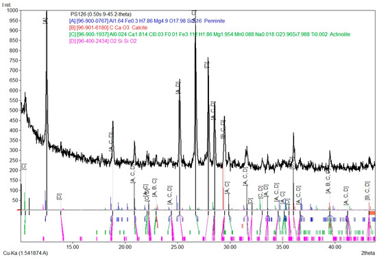 XRD results for sample PS126 from palette F6119 (Figure 3). The COD entries are: penninite 96-900-0787, calcite 96-901-6180, actinolite 96-900-1937, and quartz 96-400-2434. The scan was from 9° to 45° 2θ (step size 0.02°) with an integration time of 0.50 s.