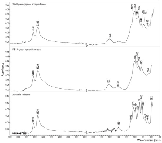 ATR-FTIR spectra for: green pigment from grindstone (PS506) (upper part), green pigment from floor next to grindstone (PS118) (central part), and reference atacamite pigment purchased from Kremer Pigmente (www.kremer.pigmente.com, accessed on 16 September 2021) (lower part). Spectra for PS506 and PS118 are similar and accord well with peaks for the Kremer atacamite reference [33].